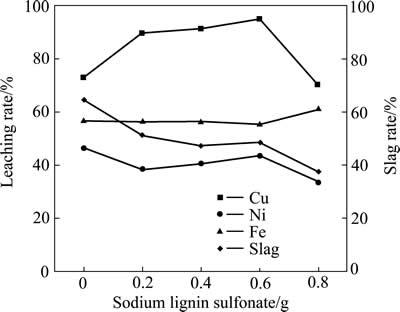 Fig. 9 Effect of sodium lignin sulfonate on Cu, Ni, Fe leaching rate and slag rate