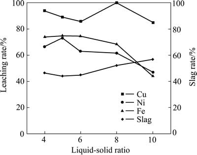 Fig. 10 Effect of liquid-solid ratio on Cu, Ni, Fe leaching rate and slag rate