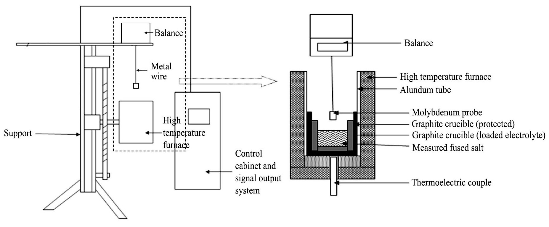 熔盐体系表面张力采用RTW-10型熔体物性仪 (鞍山科翔) 进行测定, 测试装置如图1所示, 主要包括高温电阻炉、具有升降功能的支架、由电子天平与悬挂其下方的钼测头所组成的表面张力测试单元、自动控制中心等4个部分。