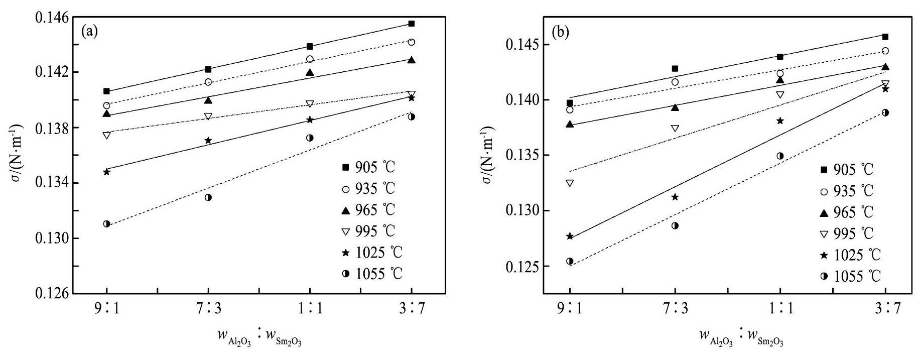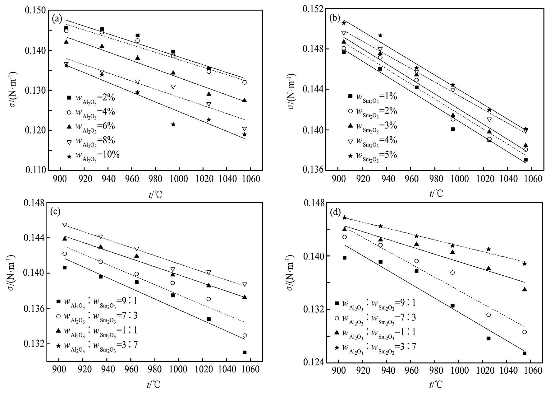 1.在温度为905~1055℃的范围内, Na3Al F6-Al F3 (12%) -Li F (5%) -Mg F2 (5%) -Al2O3, Na3Al F6-Al F3 (12%) -Li F (5%) -Mg F2 (5%) -Sm2O3及Na3Al F6-Al F3 (12%) -Li F (5%) -Mg F2 (5%) -Al2O3-Sm2O3熔盐体系表面张力随温度的升高而逐渐降低, 而且两者为线性关系。