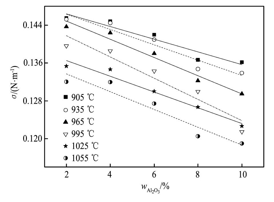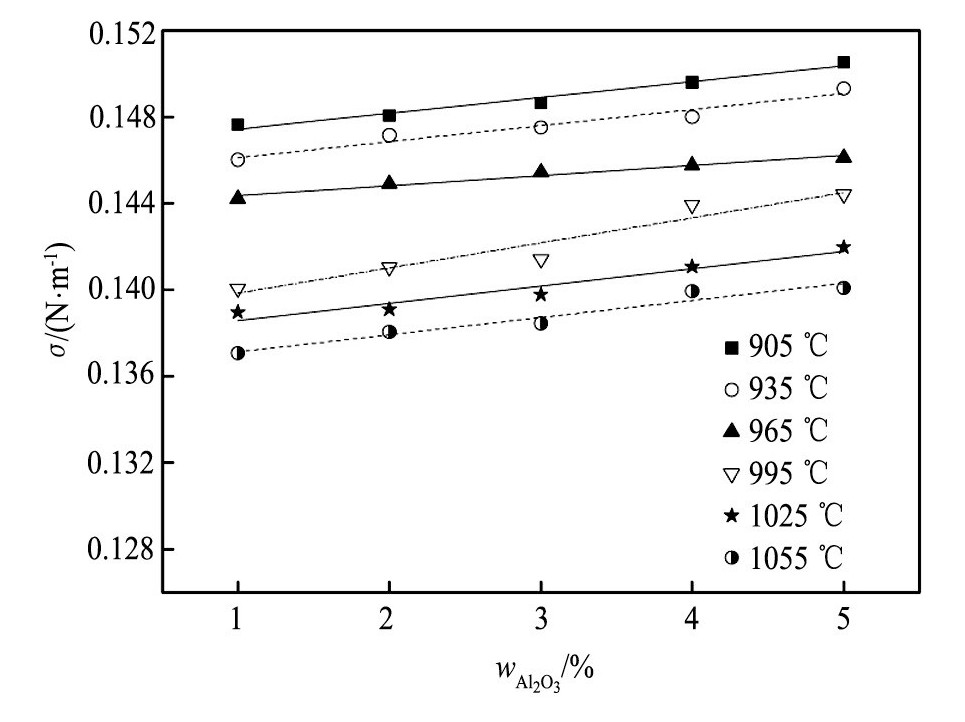 考察当往Na3Al F6-Al F3 (12%) -Li F (5%) -Mg F2 (5%) 基础熔盐体系中添加Al2O3质量分数分别为2%, 4%, 6%, 8%, 10% (Sm2O3质量分数为0%) 时, 同等温度条件下对熔盐体系表面张力σ的影响, 实验结果如图3所示。