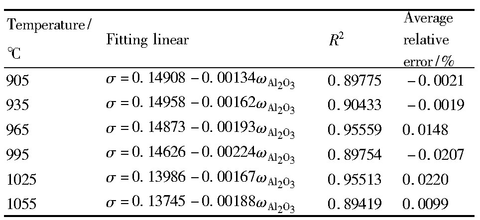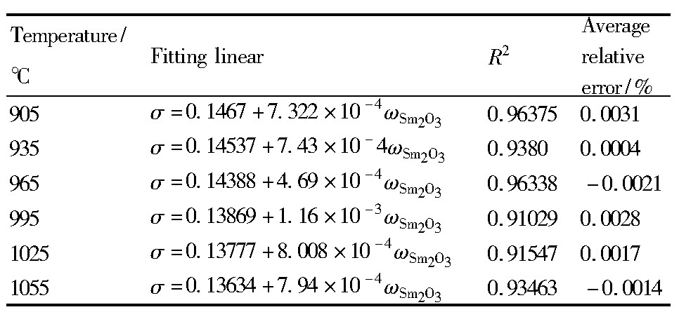 式中:σ为熔盐表面张力, N·m-1;ωAl2O3为熔盐中Al2O3的质量分数, %;ωSm2O3为熔盐中Sm2O3的质量分数, %;t为熔盐的温度, ℃。此方程的线性相关系数R2=0.90856。