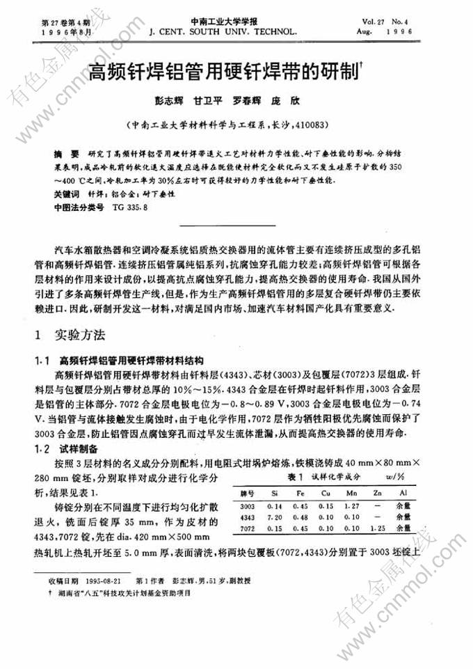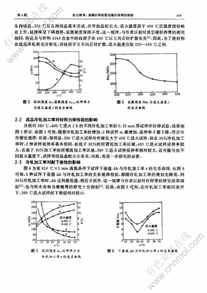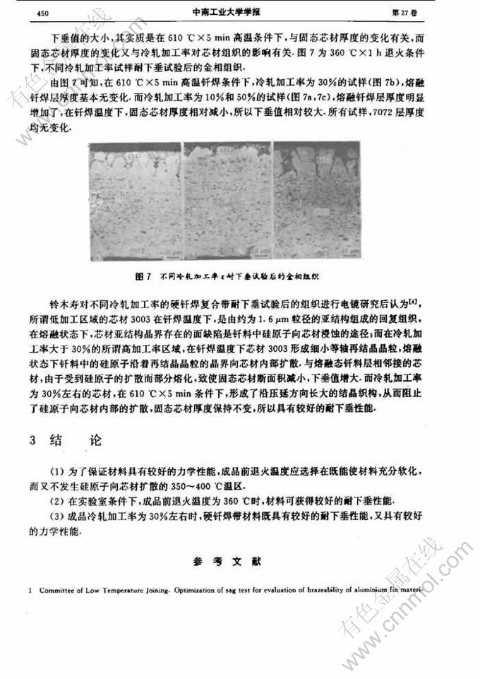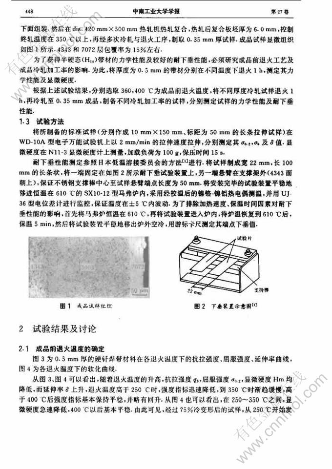 摘 要:研究了高频钎焊铝管用硬钎焊带退火工艺对材料力学性能、耐下垂性能的影响.分析姑果表明,成品冷轧前的软化退火温度应选择在既能使材料完全软化而又不发生硅原子扩散的350~400℃之间,冷轧加工率为30%左右时可获得较好的力学性能和耐下垂性能.