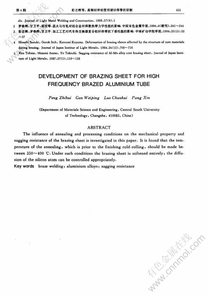 Abstract: The influence of annealing and processing conditions on the mechanical property and sagging resistance of the brazing sheet is investigated in this paper. It is found that the temperature of the annealing,which is prior to the finishing cold-rolling, should be made between 350~400 ℃.Under such conditions the brazing sheet is softened entirely; the diffusion of the silicon atom can be controlled appropriately.