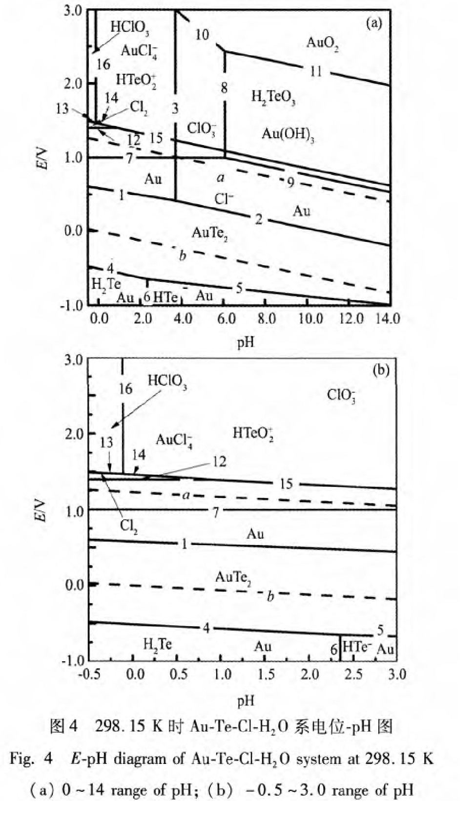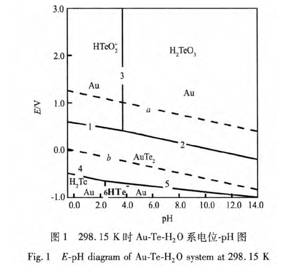 。 本文通过热力学分析, 绘制出AuTe2 氯化浸出的电位-pH图, 考察酸性氯化浸出条件下, AuTe2 氯化浸出过程中形成的各物种及其稳定区域, 为AuTe2 的氯化浸出提供理论依据。