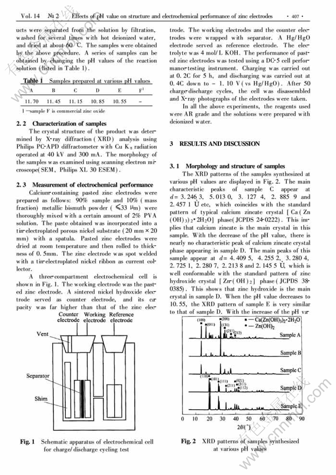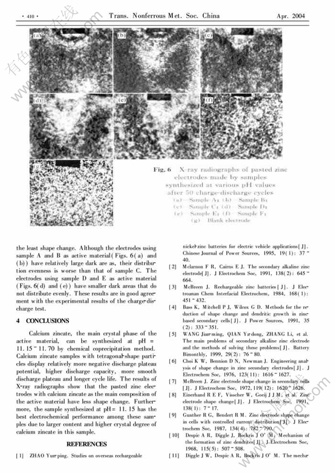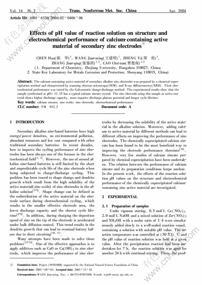 Key words:calcium zincate; zinc oxide; zinc electrode; electrochemical performance