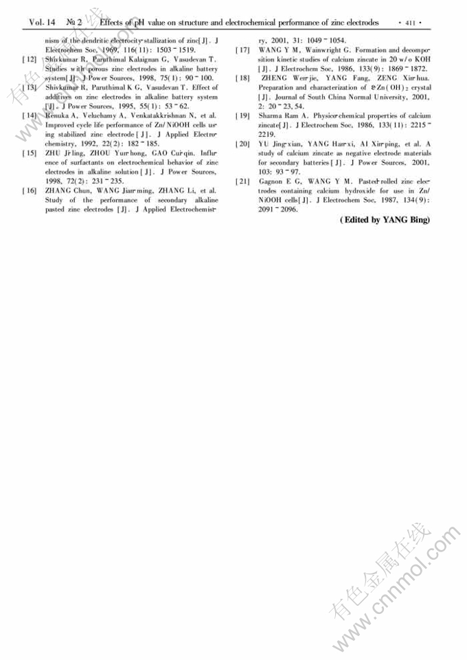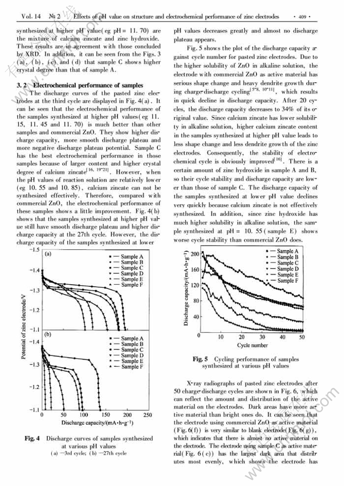 Abstract: The calcium-containing active material of secondary alkaline zinc electrodes was prepared by a chemical coprecipitation method and characterized by scanning electron microscopy(SEM) and X-ray diffractometry(XRD). Their electrochemical performance was tested by the Galvanstatic charge-discharge method. The experimental results show that the sample synthesized at pH=11.15 has a typical calcium zincate crystal. The zinc electrode using this sample as active material shows higher discharge capacity, more negative discharge plateau potential and longer cycle lifetime.