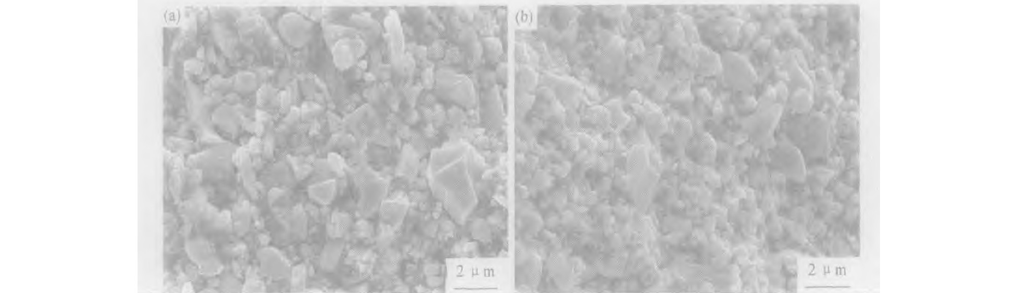 图3, 4分别为混合粉末和喂料注射坯脱脂前的SEM形貌。 图3中的粉末形貌特征表现为粉末团聚较严重, 粒度小的粉末颗粒趋向于团聚在一起。 当粉末中加入有机粘结剂后, 在高的剪切应力作用下, 将团聚态的粉末解团聚, 并与熔融态的粘结剂均匀混合而十分均匀地镶嵌在连续的粘结剂中, 图4断口形貌中粉末与粘结剂的分布情况说明了这点。