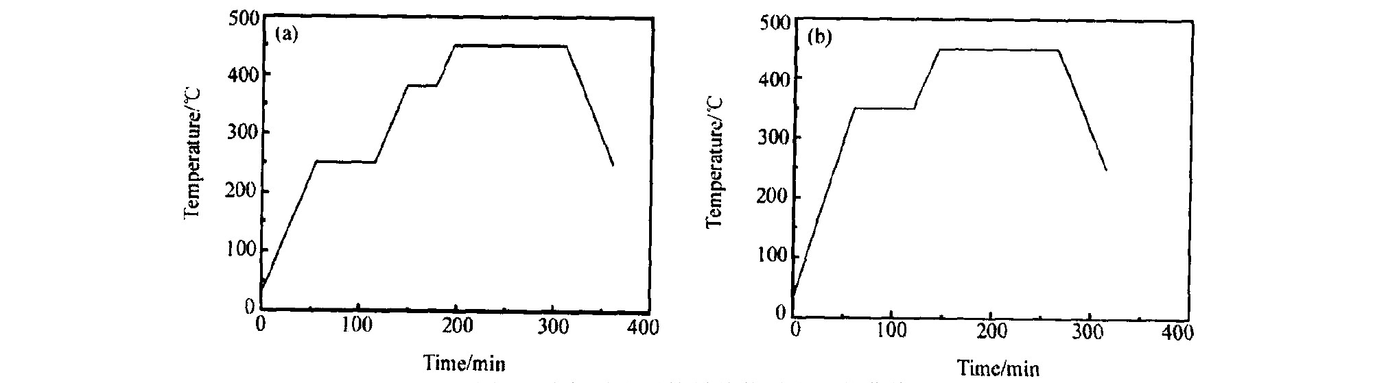 根据以上工艺参数的研究结果, 确定了1# , 2# 喂料注射样坯在纯H2 气氛下的优化脱脂曲线, 分别如图1 (a) 和 (b) 所示。 对比1# , 2# 的优化热脱脂曲线, 可以看出, 2# 喂料的在250 ℃以下只有一个保温段, 并且脱脂时间比1# 喂料减少了两个多小时 (1# , 2# 喂料的脱脂时间分别为787, 650 min) 。 按照优化热脱脂曲线脱脂, 脱脂坯均少或无缺陷。