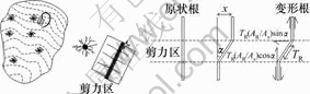 分析根土作用的常用模型有Waldron的受力平衡模型、Shewbridge基于变形特征的加筋复合土体模型、Wueta1提出的考虑根的分布和分形的随机性统计模型[3]。根纤维提高土体的抗剪强度主要是通过根土接触面的摩擦力把土中的剪应力转换成根的拉应力来实现,如图1所示。