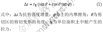 令根的表面受到足够的摩擦力和约束力使根不至于被拉出,则当土中有剪应力发生时,根的错动位移使根伸长从而使根内产生拉力TR。TR沿剪切面切线方向的分力可直接抵抗剪切变形,它沿法线方向的分力可增加剪切面上的正应力,于是,根土复合体抗剪强度的增长为: