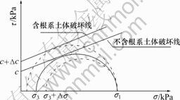 根据摩尔-库仑准则,草根的加筋增加了土体的粘聚力c,使其破坏线向上平移?c;此外,草根的张拉限制了土体的侧向变形,使σ3增大到σ3+?σ3,从而使摩尔圆向右平移?σ3,如图2所示。?c和σ3与草根密度、强度及土体性质有关[4]。
