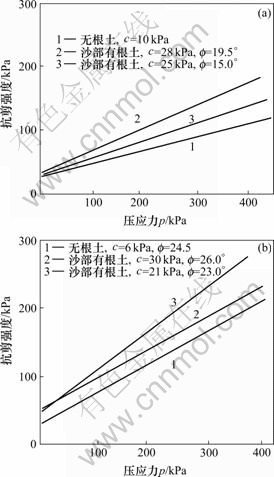 蔡强国[5]对4种压应力作用下有根土和无根土样进行三轴剪切试验,结果如图3所示。由图3可见,有根土的抗剪强度大于无根土的抗剪强度。