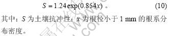 植物的根系在增强土壤的抗冲性能、减小土壤的冲刷方面起着非常重要的作用,土壤抗冲性的强弱与植物根系的分布和盘绕及固结状况密切相关。王库[9]认为植物根群呈网状,将土体肢解包裹,从而使土体抵抗风蚀和流水冲刷的能力大增,抗冲性明显提高。他在野外调查的基础上,对根径小于1 mm的根系在土体中的分布密度与土壤的抗冲性进行了统计分析,结果表明,土壤的抗冲性与根系的分布密度呈指数关系。其表达式为: