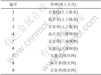 影响降雨-冲刷关系的主要因素有降雨特性(主要是降雨强度和降雨历时)、边坡坡度、固土结构、草种等。固土结构选取菱形铁丝网、土工格室、三维网垫3种。草种选取百喜草、高羊茅、百慕达3种。草种与固土结构可组合成9种形式的边坡(如表1所示),坡角选取38°,48°和58°。