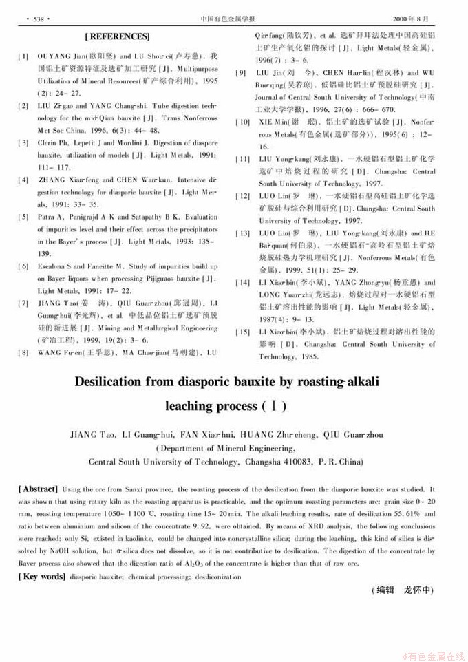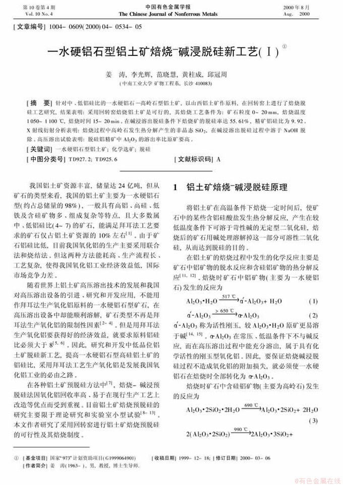 Key words:diasporic bauxite; chemical processing; desiliconization