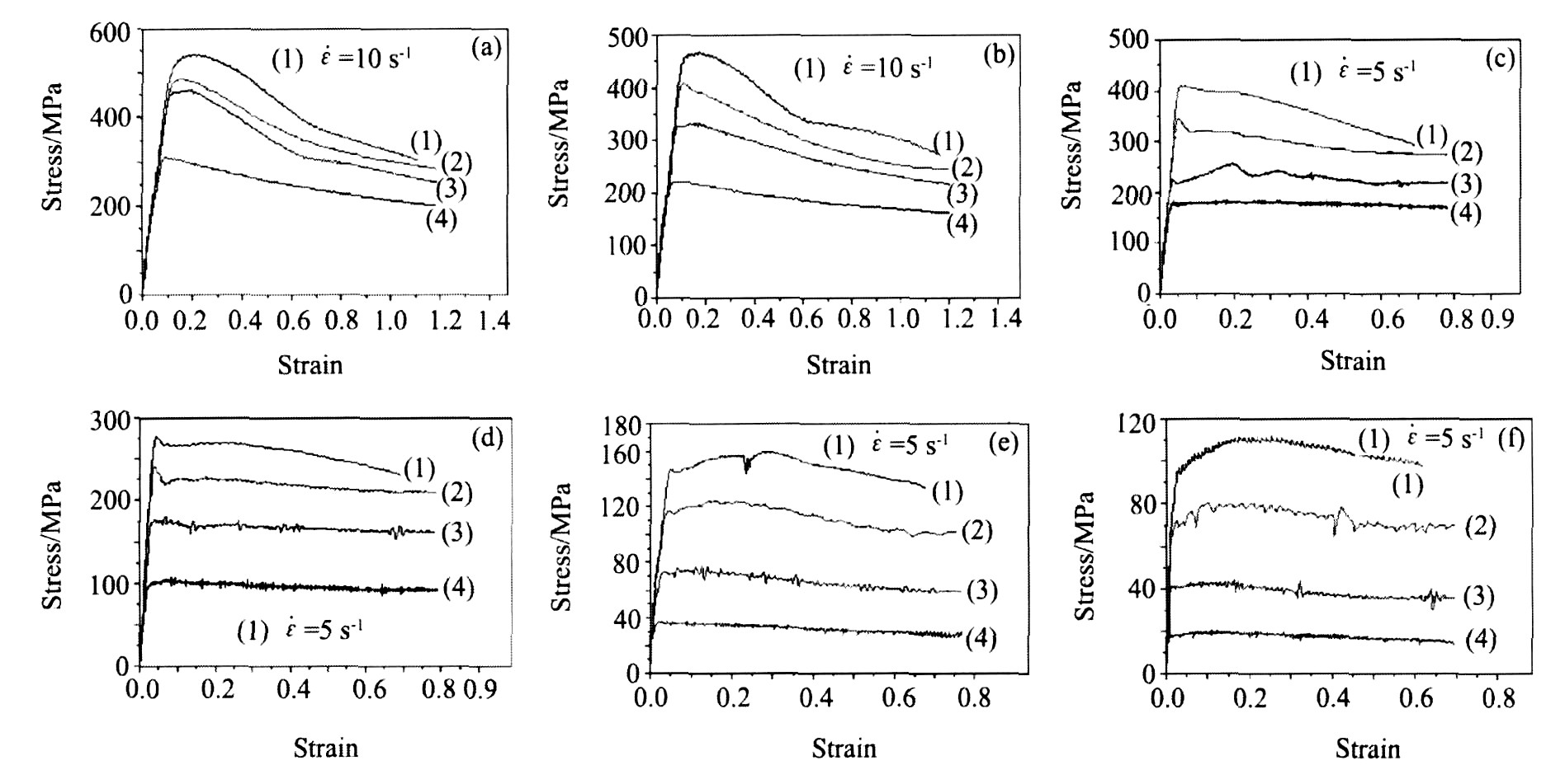 (a) 650℃σ-εcurve; (b) 700℃σ-εcurve; (c) 750℃σ-εcurve; (d) 850℃σ-εcurve; (e) 1050℃σ-εcurve; (f) 1200℃σ-εcurve; (2) ﹒ε=1.0 s-1 ; (3) ﹒ε=0.1 s-1 ; (4) ﹒ε=0.01 s-1