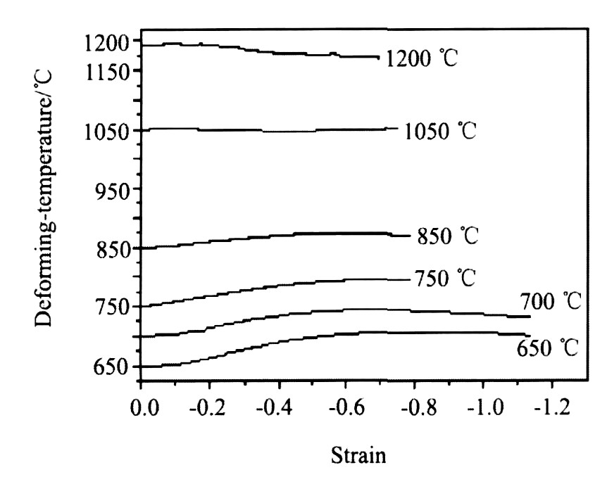 当越过应力峰值点后, 动态回复或动态再结晶软化程度超过了形变硬化, 流变应力便逐渐降低或保持动态稳定。 同时, 在塑性变形过程中90%以上的能量都转化为热能; 变形温度越低或 (和) 应变速率越大, 变形抗力也越大, 塑性变形过程中消耗的能量就越多, 转化成的热能也就越多; 且变形温度越低或变形速率越大, 单位时间内形变热散失的就越少。 因此, 随着变形温度的降低或应变速率的增大, 形变热效应就越显著, 甚至出现近似“绝热温升”现象, 如图4所示: 在应变速率为1.0 s-1 下, 初始变形温度为650 ℃时, 最大温升近100 ℃; 而初始变形温度为1200 ℃时, 最大温升约为0 ℃。 因此, 至应力峰值点后, 在同一应变速率条件下, 随变形温度的降低, 流变应力随应变量的增大而逐渐降低的程度逐渐增强。