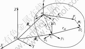 式中:Rc为物体变形后的质心在整体系中的整体位置矢量;rc为质心在结体系中的变形矢量;rdi为质点运动到Di后相对于变形后质心的位置矢量。