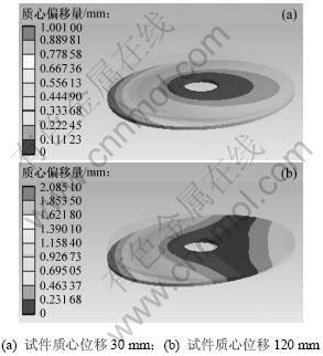 利用上述有限元模型及平台质心变化量公式,计算试件不同质心位移(试件质心与回转中心的距离)、不同受力点的浮起平台质心位移量rc。z轴的质心位移不会产生干扰力矩,这里重点研究浮起平台沿x轴、y轴的质心位移。