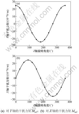(3) 绕Z轴旋转时,平台质心位移产生的对惯性坐标系X轴、Y轴的干扰力矩为角ψ的函数,分别为正弦曲线和余弦曲线,幅值为平台自身重力和质心位移的乘积,其最大值均为结体坐标系中的y轴干扰力矩。