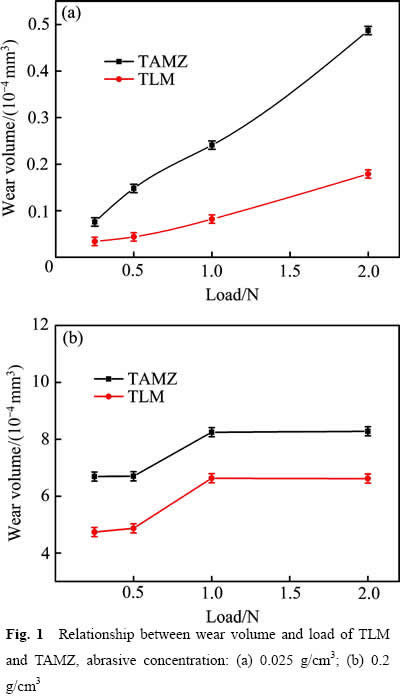 图1 TLM与TAMZ合金的磨损体积与载荷的关系
