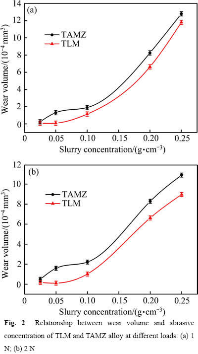 图2 TLM与TAMZ合金的磨损体积与磨粒浓度的关系