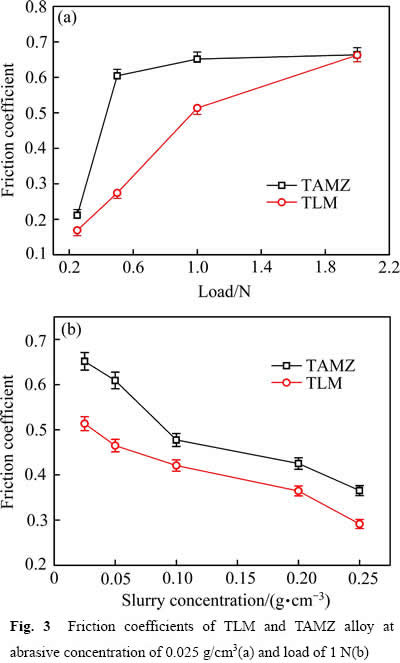 图3(a)和图3(b)所示分别为TLM与TAMZ合金的在磨粒浓度为0.025 g/cm3和载荷为1 N时的摩擦因数。两种合金的摩擦因数均随载荷增加而增大,随磨粒浓度增加而减小;且TAMZ合金的摩擦因数大于TLM合金的。通常情况下载荷通过摩擦配偶之间的接触面积和被摩擦材料的变形状态来影响摩擦磨损,当载荷增加时两摩擦配偶之间接触面积增大,两摩擦配偶相对运动阻碍随之增大,摩擦因数亦会随之增大;而磨粒浓度对摩擦因数的影响主要通过材料表面形成钝化膜[10],被摩擦表面若形成钝化膜,摩擦就会在膜层表面;由于钝化膜在磨损过程中产生,其性能要比两摩擦配偶的差,在磨损过程中钝化膜先被破坏,此时磨损表面发生粘着概率就很低,摩擦因数相应降低。由于合金表面磨损状态及合金性能不同,TLM合金的摩擦因数要低于TAMZ 合金的,说明相同条件下,TLM合金摩擦磨损时两摩擦配偶之间的破坏较小。