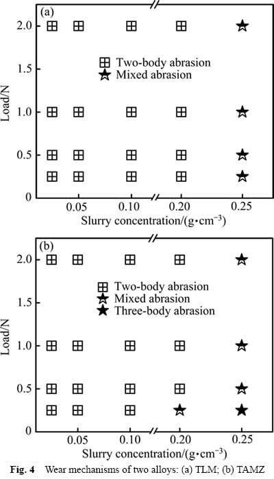 3) 通过观察合金的磨斑形貌得知,TAMZ合金所表现出来的磨损机制有二体磨损、混合磨损及三体磨损(低载荷,较高的磨粒浓度),而TLM合金仅仅表现出二体磨损和混合磨损机制。