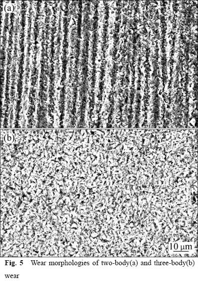 随载荷增加,两摩擦配副之间单个磨粒所承受的正压力增大,致使磨粒嵌入试样表面深度亦会增加,同时磨粒还受到与滑动方向一致的切应力的作用,在切应力作用下滑动,对试样表面进行切削,之后试样表面出现平行于滑动方向的沟槽,使试样表面被磨损部位发生塑性变形而沿沟槽两侧堆积,在之后的磨损过程中堆积部分在正压力作用下又被碾平,如此循环往复变形、堆积、碾平,最终导致在试样表面产生裂纹而引起材料剥落,使得材料磨损体积增加;同时剥落的材料在滑动作用下进入两摩擦配副之间,并以硬质颗粒或磨粒的形式参与到磨损过程中,进一步加剧材料的损失。