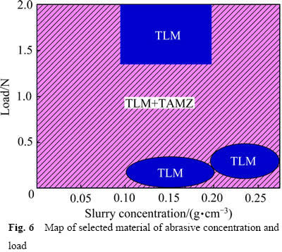 4) 由材料优选图可知,TLM合金在本实验条件下均可被选择;浓度较高(0.1~0.25 g/cm3)、载荷小于0.5 N或在1.5~2.0 N范围内TAMZ合金不可选。