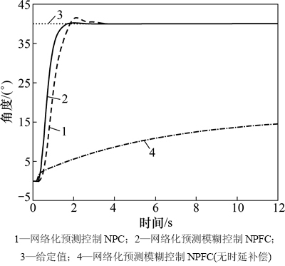 假设前向网络通道有6步时延,反向网络通道有1步时延。分别采用PID控制和NPFC控制方法(如图6所示),NPFC采用与情形二相同的参数,PID控制器的参数为Kp=0.022,Ki=0.02/0.022,Kd=0.003/0.022。从图6可以看出:时延对控制系统的性能影响很大,而PID控制器不能很好的补偿时延,导致动态响应变慢,超调量增大。NPFC方法在模型预测、时延补偿、变论域等机制的共同作用下,曲线很快能达到和没有时延时相同的控制效果。