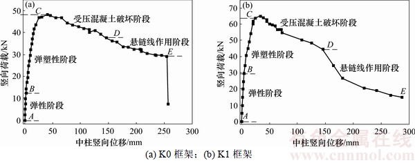 图4所示为K0和K1框架中柱竖向荷载-位移关系曲线。从图4可以看出:曲线可以分为4个工作阶段,即弹性阶段AB、弹塑性阶段BC、受压混凝土破坏阶段CD和悬链线作用阶段DE。