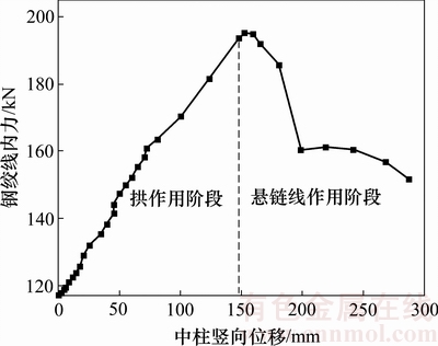 图6所示为K1框架钢绞线内力-跨中竖向位移关系。从图6可以看出:随着中柱竖向位移增加,钢绞线内力增大,最大钢绞线内力约为195 kN。在这一阶段,压拱作用使框架柱向外侧移动从而导致这一阶段钢绞线内力持续增大。当中柱竖向位移达到146 mm左右,框架梁跨中塑性铰转动中心位于其支座塑性铰转动中心以下时,框架柱开始向内运动,钢绞线两锚固端间的距离变小,钢绞线内力减小,由“拱作用阶段”转化为“悬链线作用阶段”。