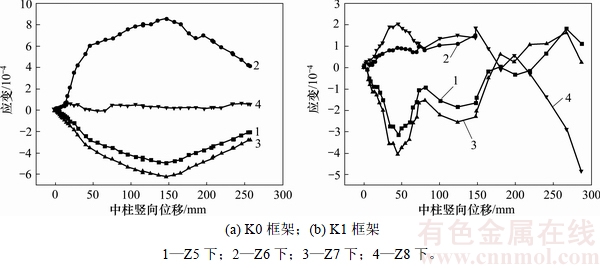 框架柱底混凝土表面应变与中柱竖向位移之间的关系如图7所示。对于K0框架(见图7(a)),当中柱竖向位移约145 mm时,框架柱底外侧混凝土(Z5下、Z7下,见图2)达到压应变峰值,随后压应变开始减小;框架柱底内侧混凝土(Z6下、Z8下,见图2)达到拉应变峰值,随后拉应变开始减小。由此可见,柱下端混凝土表面应变的变化情况与柱顶水平位移变化情况是一致的。当中柱竖向位移达145 mm时,框架水平位移由向外转为向内。在弯矩和轴力的共同作用下,框架柱底外侧受拉而内侧受压,直到柱下端外侧出现横向裂缝后,发生内力重分布。