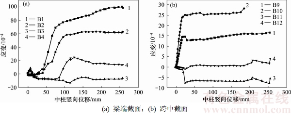 对于K0框架(见图8),梁端底部钢筋(B1和B2)在加载初期承受压力,但是压力不大,说明此时大部分压力由混凝土承担。钢筋应变随着竖向位移增大而缓慢增大,当框架梁的受弯承载能力耗尽时,压应变达到峰值。随着框架进入受压混凝土破坏阶段(中柱竖向位移大于50 mm),钢筋应变B1和B2所承受的拉应力急剧增加,并且很快达到受拉屈服,这表明悬链线作用正在逐渐形成。梁端顶部钢筋(B3和B4)在加载初期承受拉力,受轴向压力的影响,顶部钢筋(B3和B4)的拉应变逐渐减小并变为压应变,且随着中柱竖向位移增大,压应变逐渐增大。框架梁内的轴向力达到峰值后开始减小,受其影响,顶部钢筋应变也达到压应变峰值,随后减小。B4钢筋应变发生从受压向受拉转变,转变点出现在100~150 mm范围内,说明此时梁端截面已进入塑性阶段。从图8(a)可知:梁端顶部钢筋B3和B4均未达屈服。对于跨中截面,底部钢筋(B9和B10)与顶部钢筋(B11和B12)在加载初期分别承受拉力与压力,当中柱竖向位移达到29 mm时,两者先后达到应变峰值。随着框架进入受压混凝土破坏阶段(中柱竖向位移大于50 mm),梁端截面开始塑性转动,跨中截面底部和顶部钢筋应变基本保持不变。