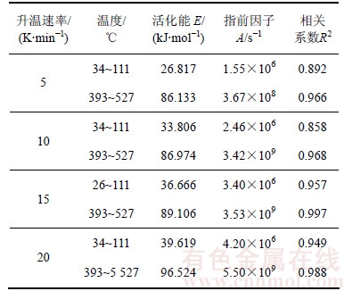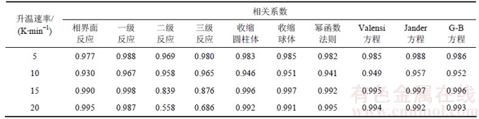 -1 000/T的一组曲线;曲线中线性相关性最佳的动力学函数就是硫化矿石氧化分解过程的反应机制,具体结果如表2所示。由表2可知:一级反应动力学函数在4种升温速率下的对应相关性系数最大,因此,硫化矿石氧化分解过程的反应机制为一级反应动力学函数,即