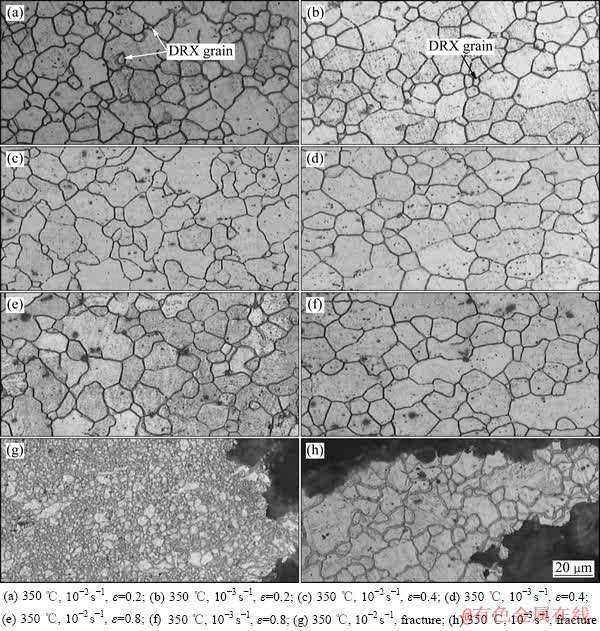 在350 ℃拉伸至不同应变时,材料在10-2 s-1(以下简称高速)和10-3 s-1(以下简称低速)应变速率条件下的显微组织分别如图3(a)和(b)所示,水平方向为拉伸方向。当应变为0.2时,在两种应变速率条件下孪晶基本消失,且出现了等轴的动态再结晶(DRX)晶粒。大部分再结晶晶粒在晶界交汇处形核,少量在晶内的孪晶或二相粒子处形核,如图3(a)中箭头所示。高速拉伸显微组织中的晶界曲率较大,而低速拉伸显微组织中的晶界较为平直,表明在低速下有更多的位错、原子及空位与晶界发生相互作用而使晶界能降低。当应变为0.4时(见图3(c)和(d)),低速拉伸显微组织以晶界较为平直的等轴晶粒为主,动态再结晶晶粒发生一定程度的长大,而在高速拉伸显微组织中依然存在不规则的原始晶粒,直至应变增至0.8时(见图3(e)和(f))才以等轴的再结晶晶粒为主。试样断口处的显微组织(见图3(g)和(h))均由大量细小的再结晶晶粒组成,在高速拉伸条件下的晶粒尤为细小,由大量尺寸为1~2 μm的细小晶粒组成,这是由于变形时间较短,断裂前通过再结晶、原子和空位扩散运动释放的能量有限,使试样在断裂前储存了较高的畸变能,发生再结晶时的形核率较高,导致晶粒显著细化。