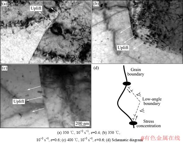 图10所示为试样在高温区(573 K以上)进行拉伸变形时发生非连续动态再结晶的TEM像。由图10(a)可见,晶界处的高位错密度区出现了晶界的局部迁移,产生了晶界局部凸起。高温下位错的滑移变得容易,位错滑移的局部化使原始晶界局部迁移,形成凸起,非平面的晶界滑移导致强烈的应变梯度。晶界位错源为了协调塑性变形向晶粒内部发射位错,这些位错与基面位错相互作用形成亚晶界,亚晶界切割晶粒的凸出部分。这些亚晶界随应变的进行不断吸收晶格位错从而提高取向差,最后发展成大角度晶界,这与不连续动态再结晶机制相吻合。不连续动态再结晶要求晶界具有较大的迁移活动能力,变形温度越高,晶界的迁移能力就越强,越容易发生不连续动态再结晶。这种现象也在温度为350和400 ℃,速率为10-3 s-1,应变为0.6的条件下存在,如图10(b)和(c)所示。