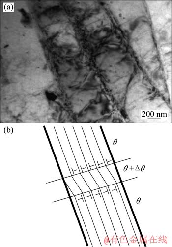 Fig. 11 TEM image (a) and schematic diagram (b) of TDRX under tensile test conditions of 350 ℃, 10-2 s-1, ε=0.6