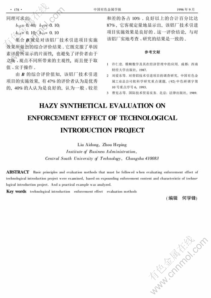 Abstract: Basic principles and evaluation methods that must be followed when evaluating enforcement effect of technological introduction project were examined, based on expounding enforcement content and characteristic of technological introduction project. And a practical example was analyzed.