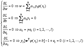 LS-SVM方法是将最小二乘线性系统引入到SVM中,采用二次规划法解决分类和函数估计问题。其基本思想是用一个非线性映射j(x)将输入向量映射到高维空间F,然后在这个空间构造最优化决策函数: