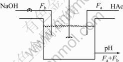 目前pH中和过程通用的是McAvoy等[10]提出的模型,此模型的对象是CSTR,如图1所示。对此对象有三点假设:溶液是均匀的;所有的离子完全溶解;反应瞬时完成。通过这样的假设,对象的模型可表示为: