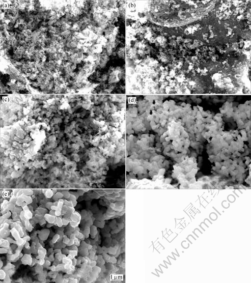Fig.1 SEM images of LiNi1/3Co1/3Mn1/3O2 samples calcined at different temperature: (a) 750 ℃; (b) 800 ℃; (c) 850℃; (d) 900 ℃; (e) 950 ℃