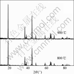 The X-ray diffraction patterns of LiNi1/3Co1/3Mn1/3O2 samples are shown in Fig.2. The XRD patterns of the samples are similar to that of LiCoO2 (α-NaFeO2 type, space group R3m) and can be indexed as hexagonal lattice. The transition metal atoms (M=Ni, Co, Mn) are supposed to be randomly distributed on the 3b sites, whereas the lithium atoms occupy the 3a sites and O atoms occupy the 6c sites. No obvious impurity phase peaks can be observed, indicating that the synthesized samples are single phase. In XRD patterns, the splitting of (006)/(102) peak and (018)/(110) peak are regarded as the indications of characteristic of layered structure materials[15]. From the observation of peak splitting of (006)/(012) and (018)/(110) near 38? and 65?, respectively, it can be seen that the layered structure is well developed[5]. The peak splitting in the XRD pattern of LiNi1/3Co1/3Mn1/3O2 synthesized at 900 ℃ is more obvious than that of LiNi1/3Co1/3Mn1/3O2 synthesized at 800 ℃, indicating that layered structure is better when the calcination temperature is higher.