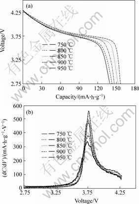Fig.4 Initial discharge characteristics of LiNi1/3Co1/3Mn1/3O2 samples calcined at different temperatures: (a) Voltage vs capacity profiles; (b) Differential capacity vs voltage profiles