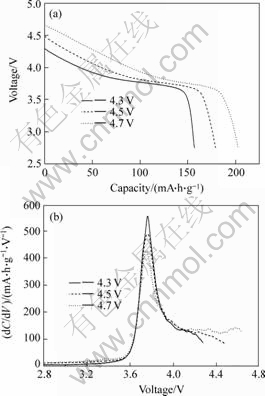 Fig.6 Voltage curves(a) and differential capacity vs voltage curves(b) for LiNi1/3Co1/3Mn1/3O2/Li cell changing upper cut-off voltage limit