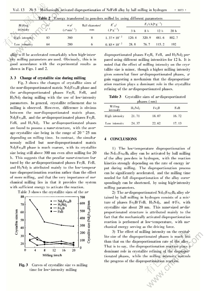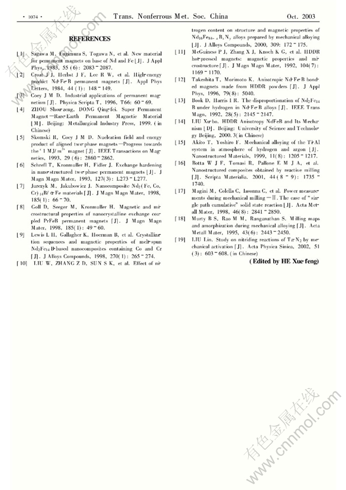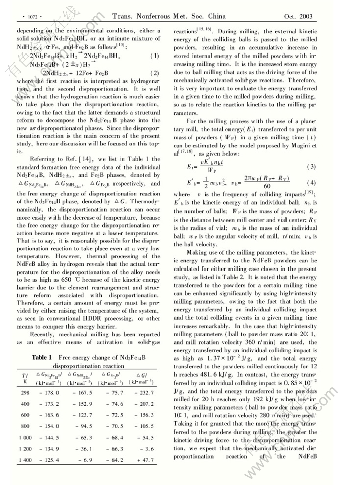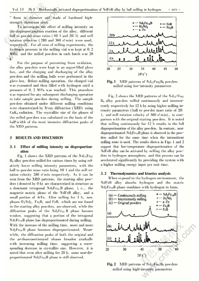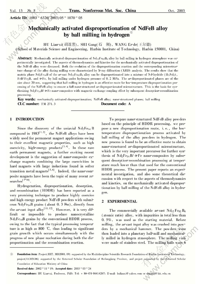 Key words:mechanically activated disproportionation; NdFeB alloy; nano-structured phases; ball milling