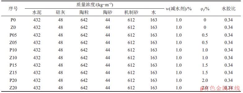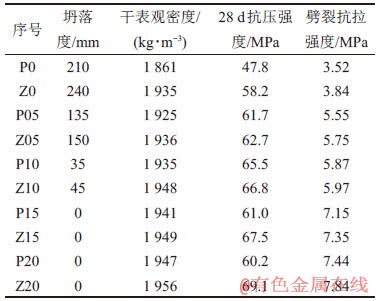 为对比不同搅拌方式对SFHSLC性能的影响,设置0,0.5%,1.0%,1.5%和2.0% 5个钢纤维体积掺量, P0~P20代表普通强制式搅拌方式,Z0~Z20代表振动搅拌方式,具体配合比见表4。其中,减水剂按胶凝材料质量分数掺加,钢纤维掺量按混凝土体积分数计,用φf表示。