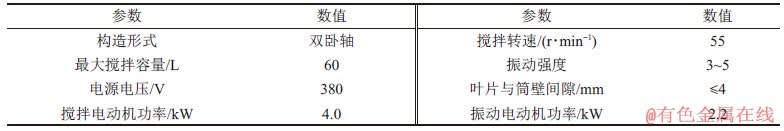 试验使用的德通许昌双卧轴振动搅拌机的参数见表5,利用搅拌轴和搅拌叶片作为振动活化源,搅拌叶片的排列形式与传统双卧轴搅拌机一样,具有涡旋搅拌特征[17]。物料在搅拌轴和搅拌叶片的振动和强制搅拌下,很快实现均匀拌和。该装置的最大特点是:搅拌机构与激振器一体化设计,搅拌叶片边搅拌边振动,作用面积和空间大, 振动能量分布均匀,只需较小的振动强度就能达到较好的搅拌效果[18]。对混凝土拌合物进行振动搅拌,可以使物料颗粒处于颤振状态,物料间的内摩擦力大大降低,便于水泥颗粒分散[19]。